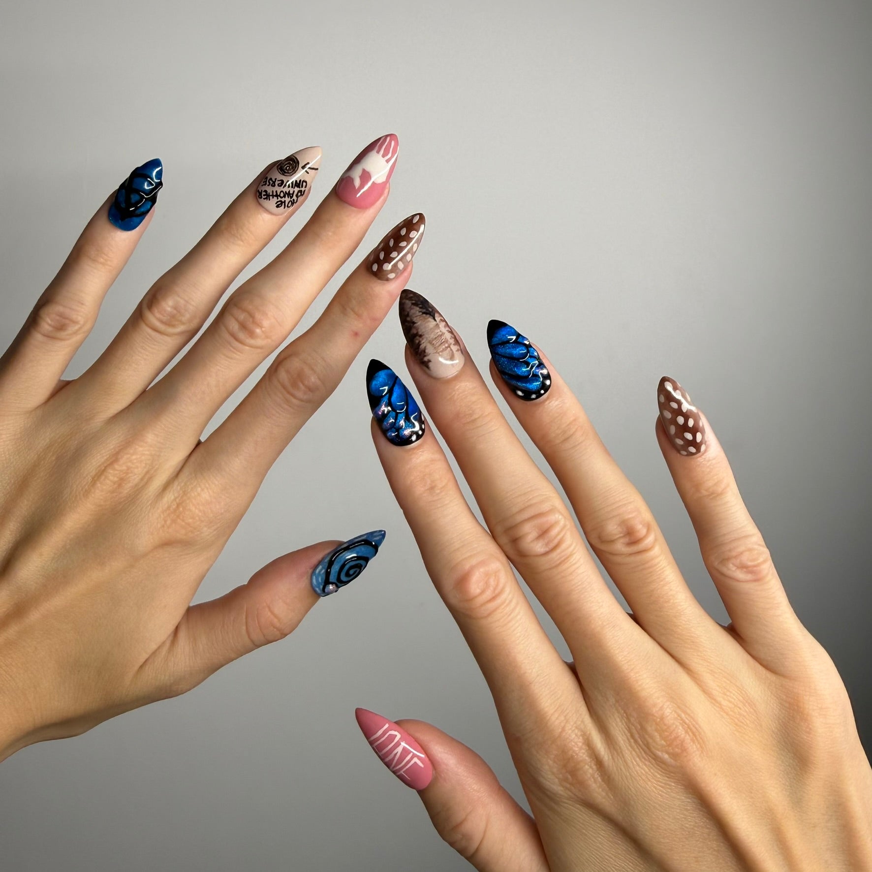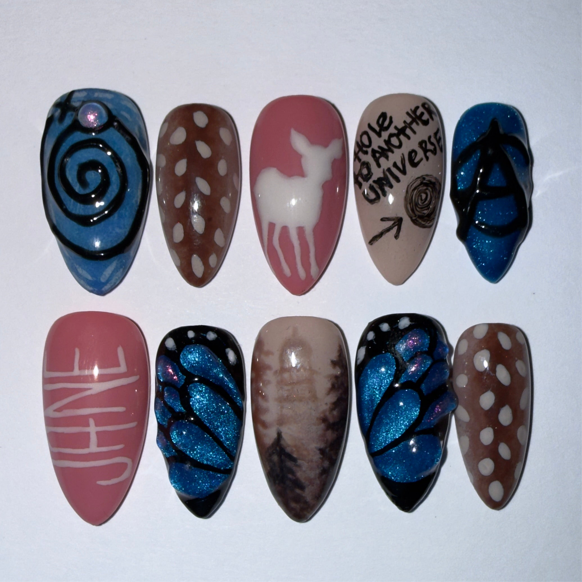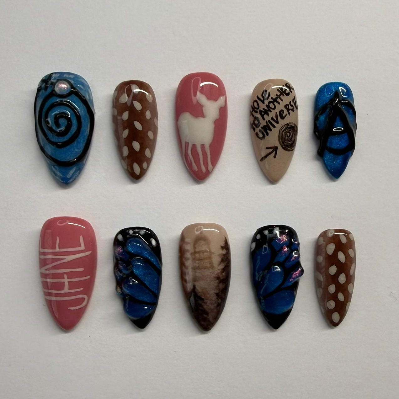 Every Nail is handpainted. Details include: Reflective 3D Butterfly wings, a lighthouse and Max's iconic pink deer T-shirt + Chloe's wall graffiti.